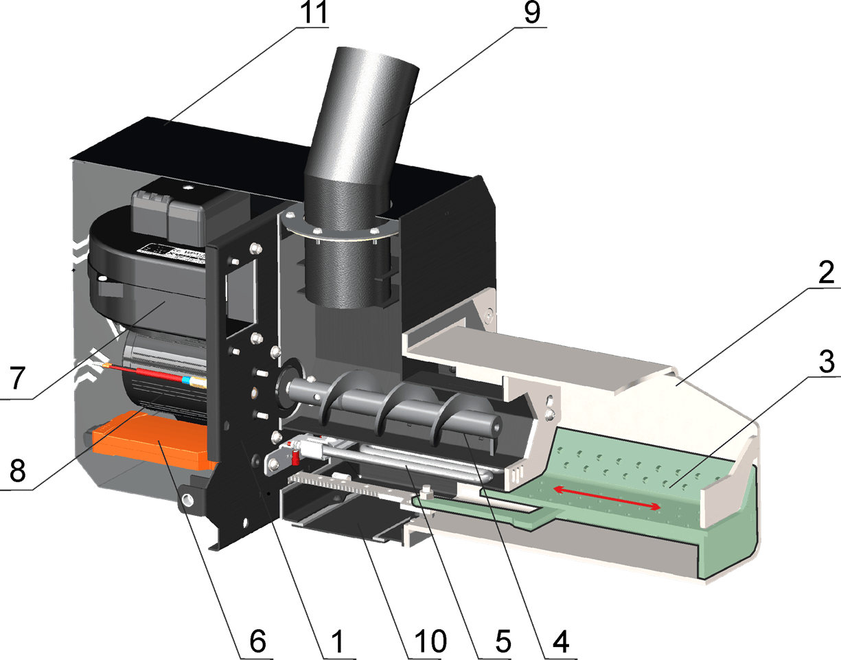 1 - Корпус горелки 2 - Корпус топки 3 - Подвижная чаша топки 4 - Шнек подачи топлива 5 - Нагревательный элемент системы автоподжига 6 - Механизм автоматического перемещения чаши топки 7 - Вентилятор наддува 8 - Мотор-редуктор 9 - Труба приема топлива 10 - Лючок чистки горелки (3 шт.) 11 - Защитный кожух |