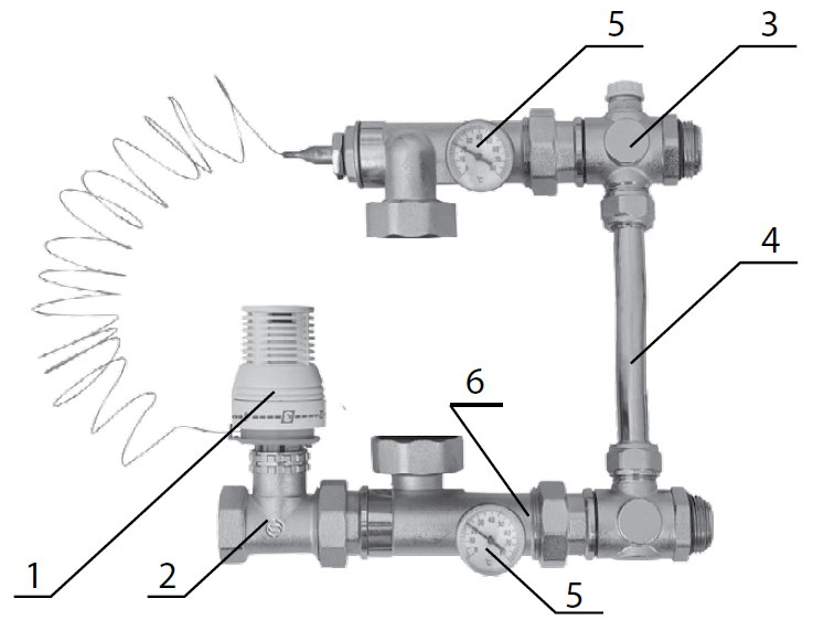 Смеситель состоит из термостатического клапана, используемого в сочетании с балансировочным клапаном. Балансировочный клапан с помощью запорно-регулирующего элемента регулирует количество воды, возвращающейся из обратного контура, направляемое для подмешивания с водой, поступающей в подающий коллектор вторичного контура (теплый пол). Обратный клапан предотвращает попадание горячего теплоносителя, поступающего из котла в обратный коллектор.