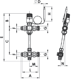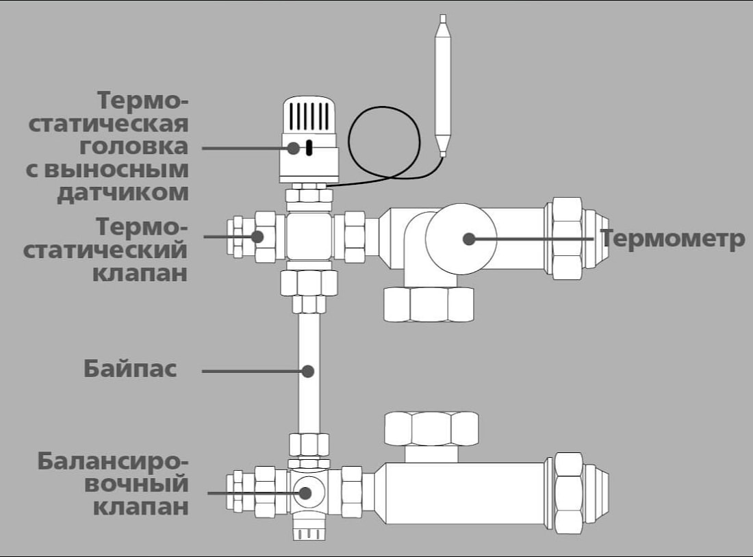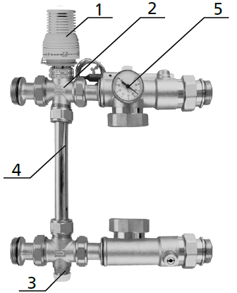 Смеситель состоит из термостатического клапана, используемого в сочетании с балансировочным клапаном. Балансировочный клапан с помощью запорно-регулирующего элемента регулирует количество воды, возвращающейся из обратного контура, направляемое для подмешивания с водой, поступающей в подающий коллектор вторичного контура (теплый пол). Обратный клапан предотвращает попадание горячего теплоносителя, поступающего из котла в обратный коллектор.